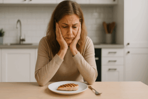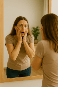 Wenn du dauerhaft Spannung hältst – sei es durch Grübeln, Konzentration oder einfach, weil du’s gewohnt bist – verspannen sich die Muskeln im Gesicht. Dadurch staut sich Lymphe, die Durchblutung wird schlechter, die Haut wirkt grau und verliert an Elastizität.