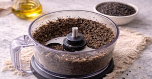 Die Samen in einen Hochleistungsmixer oder Food Processor geben. Zuerst entsteht ein feines Sesammehl.