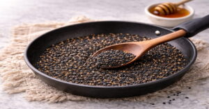 Gib die schwarzen Sesamsamen in eine Pfanne ohne Öl und röste sie bei mittlerer Hitze etwa 3–5 Minuten, bis sie leicht duften. Dabei regelmäßig rühren, damit sie nicht verbrennen.